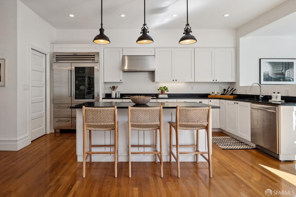 This expansive Inner Mission home offers five bedrooms and three full baths, plus a legal one-bed/one-bath unit with a separate entrance. At the heart of the home is an open chef's kitchen, family room, and dining area designed for everyday comfort and effortless entertaining. Large french doors lead directly to a private outdoor haven featuring multiple decks and a turfed backyard. Upstairs, the generous en-suite primary suite sits quietly at the rear and opens to its own secluded deck, while two additional bedrooms share a convenient Jack-and-Jill bath. The main living level also includes two versatile bedrooms, a second living room, and a full bath, offering excellent flexibility for guests or a home office. With its own entrance, the lower level provides a fully independent one-bedroom unit, ideal for extended family, guests, or rental income. A two-car, side-by-side garage adds abundant storage and easy city living.