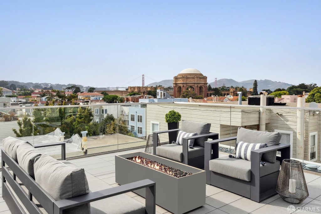 Perched atop the Marina, 3307 Broderick is a rare modern penthouse designed for effortless indoor/outdoor living. Completed in 2016 within an exclusive two-unit building and accessed by private elevator, this 4-bedroom, 3.5-bath home spans two levels and culminates in a deeded 690 sf private roof deck with a fire pit and sweeping 360 views of the Golden Gate Bridge, Palace of Fine Arts, and city skyline. The upper level offers a grand entertaining space where expansive Bonelli retractable doors open to a west-facing 285 sf terrace, perfect for dining al fresco or gathering with friends. The chef's kitchen boasts Miele appliances, a wine refrigerator, and a striking Statuario Carrara marble island. All bedrooms occupy one level, including a serene primary suite with spa-inspired bath, soaking tub, double vanity, and walk-in closet. High ceilings, radiant-heated oak floors, skylights, and integrated smart-home features complement deeded garage parking. Just steps from the Marina Green and Chestnut Street's vibrant shops and dining, this residence offers San Francisco luxury at its finest.